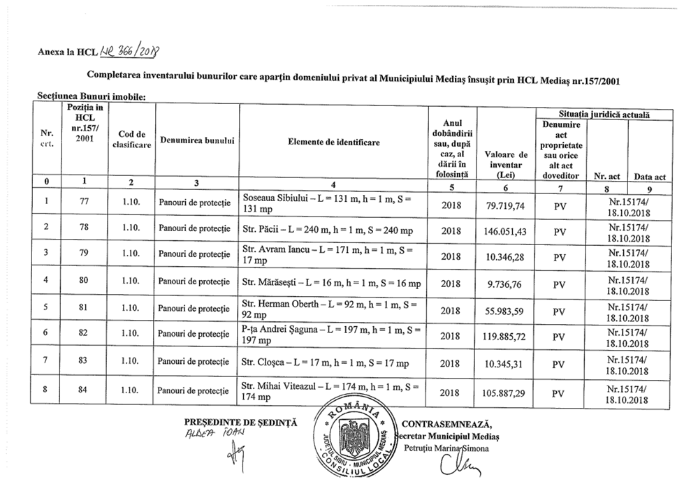 Cautand prin documentele publice am vazut ca domnul Roman Gheorghe si-a propus sa construiasca in jur de 1800 mp(ml) de astfel de panouri de protectie in tot Mediasul. In prima faza, asa cum rezulta din HCL nr.366/26/11/2018 si anexa aferenta, publicate mai sus, au fost realizati 884 mp(ml) de asemenea panouri, cu o valoare de 537956 lei. Facand un simplu raport, rezulta ca municipiul Medias a platit 608.54 lei pe metru patrat sau metru liniar de gard de teava rectangulara, adica, la cursul valutar din 2018, o suma de 132 euro/mp(ml).